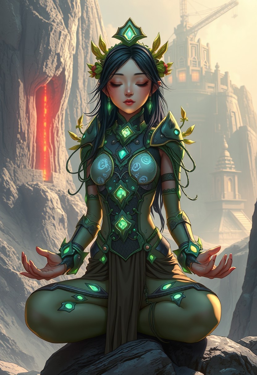 comic image of an asian female animation character in the style of Enki Bilal , Holographic and translucent elements , with Bio-engineered plant armor with bioluminescent vines outfit, Hovering just above the ground in meditation, Colossal alien fortress carved into the side of a mountain, Flashing warning lights in an emergency, graphic illustration, comic art, graphic novel art, vibrant, highly detailed, Highest-Quality, 4k, intricate details, visually stunning, Masterpiece
