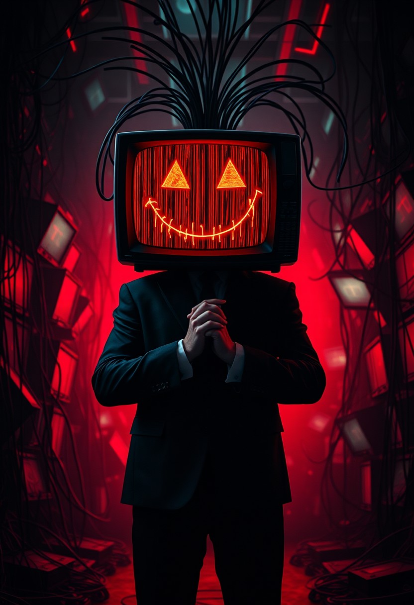 Cinematic, Beauty, Realism, Light and Shadow, Cinematography, Film Stills, A surreal and eerie scene featuring a man with a television as his head, displaying a sinister red smiley face dripping with digital distortion. The figure is dressed in a sharp, dark suit, standing in a dimly lit, dystopian environment. Thick, black cables emerge from the back of the TV head, intertwining with the background's chaotic mess of wires and broken screens, all bathed in an ominous red glow. The hands are clasped together, giving off a menacing yet composed demeanor, as if he is in control of this chaotic digital landscape. The atmosphere is dark, unsettling, and charged with a sense of looming danger. Highest-Quality, 4k, intricate details, visually stunning, Masterpiece