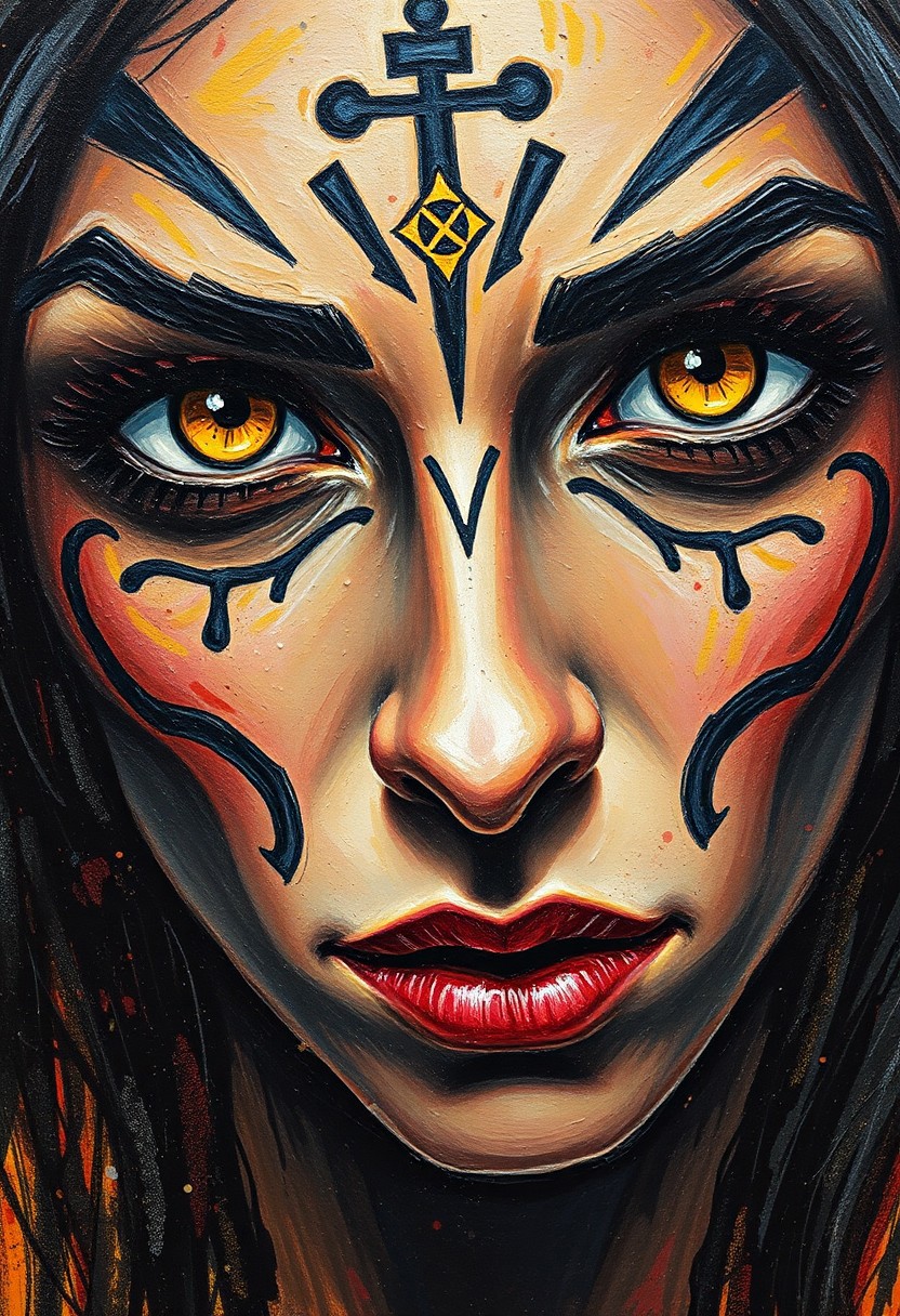 Impressionist crayon painting by Russ Mills, a close up portrait of woman's face, tattooed face, occult signs, yellow lively eyes, egyptcore, splash art, energetic brush strokes, gloomycore, extremely best quality, awarded masterpiece, octane render, Highest-Quality, 8 k, intricate details, visually stunning, Masterpiece