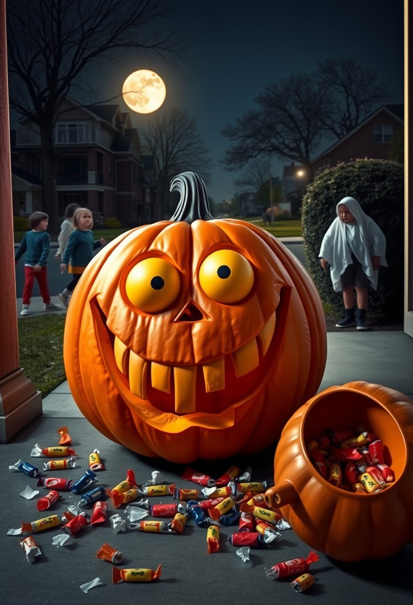 A large jack-o-lantern with an exaggerated, goofy grin and oversized, bulging eyes. The pumpkin is sitting on a porch surrounded by scattered candy wrappers and a tipped-over bowl of candy. The background is a moonlit suburban street, with children in the distance dressed in comical costumes, like a dog dressed as a cat and a ghost with its sheet tangled up in a bush. The whole scene is playful and lighthearted, capturing the goofy chaos of Halloween night.