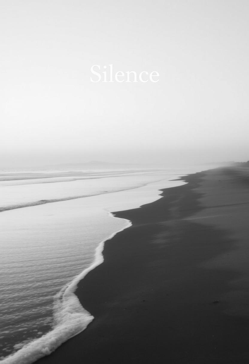 A minimalist black-and-white image of a vast, empty beach at dawn, with soft waves gently lapping at the shore. The word 'Silence' is written at the top in a quiet, unobtrusive font.