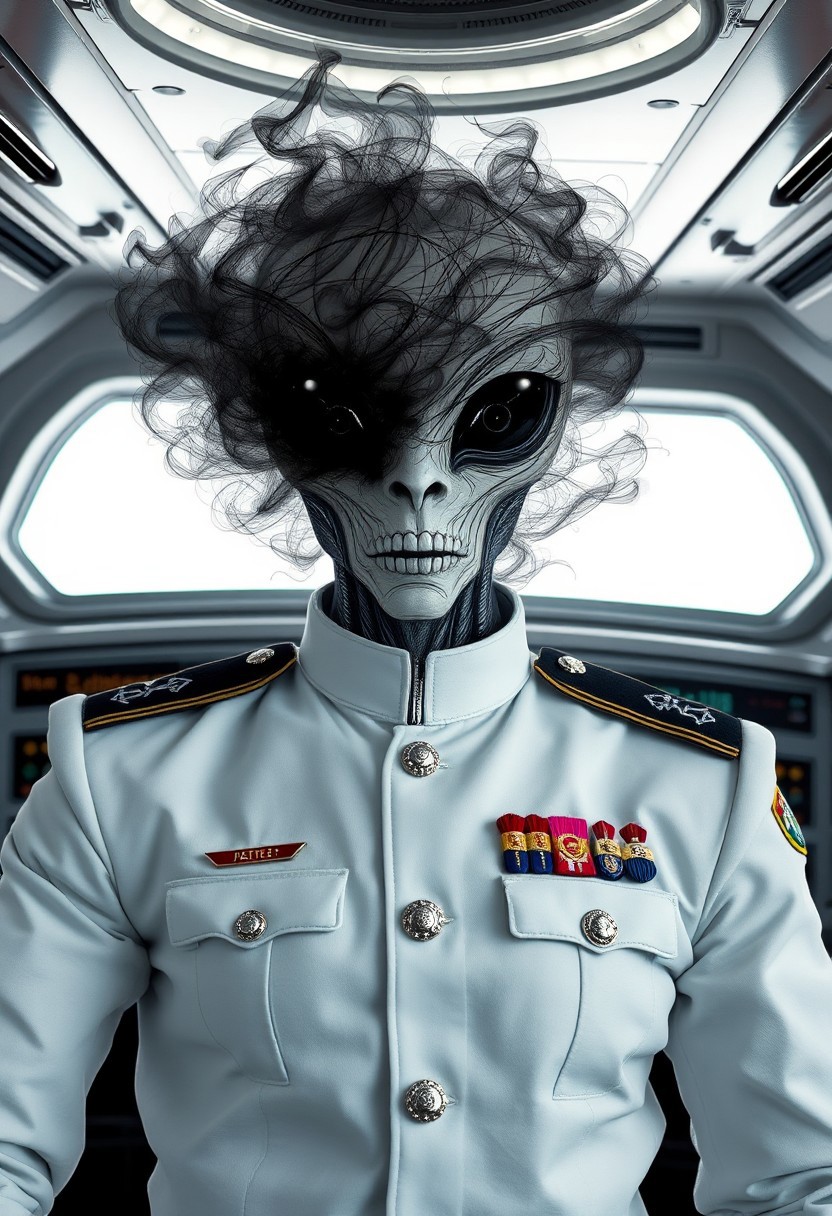 aboard an intergalactic alliance spaceship, we meet the captain, the uniform is white with many decorations from his services during wars. The captain is an alien made of vapor and energy, to us he looks like cloud of black smoke and ink doodle, a human like silhouette made of scribbled crossing black ink lines, lines that pulsate like under an electric current, round where eyes would be, are two levitating gems clouded by the black smoke and lines.
