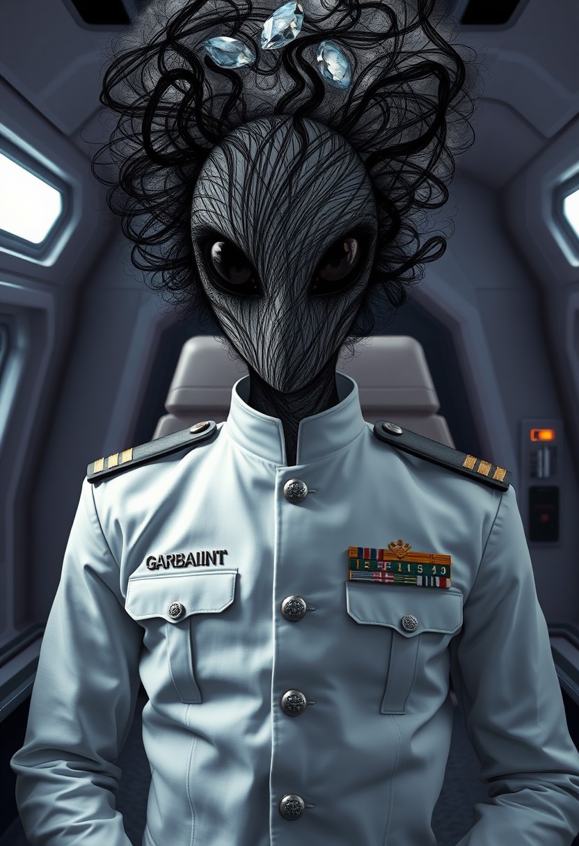 aboard an intergalactic alliance spaceship, we meet the captain, the uniform is white with many decorations from his services during wars. The captain is an alien made of vapor and energy, to us he looks like cloud of black smoke and ink doodle, a human like silhouette made of scribbled crossing black ink lines, lines that pulsate like under an electric current, round where eyes would be, are two levitating gems clouded by the black smoke and lines.