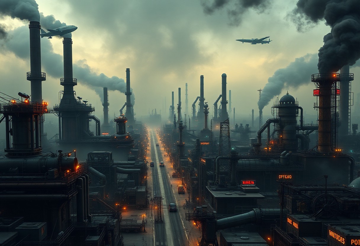 dieselpunk cityscape, towering industrial buildings, thick smog filling the air, dark gritty atmosphere, roaring diesel engines, massive exhaust stacks, grungy textures, riveted steel structures, World War II era aesthetics mixed with futuristic technology, airships and massive propeller planes flying overhead, mechanical vehicles belching smoke, heavy machinery in constant operation, detailed oil-stained streets, dark and moody lighting, rust-covered industrial equipment, glowing oil refineries, mechanical arms lifting heavy loads, thick black smoke rising from factories, neon signs contrasted with industrial grime, high resolution, ((masterpiece)), industrial wasteland surrounding the city, energy pipelines running across buildings, loud mechanical hum in the atmosphere, war-torn remnants