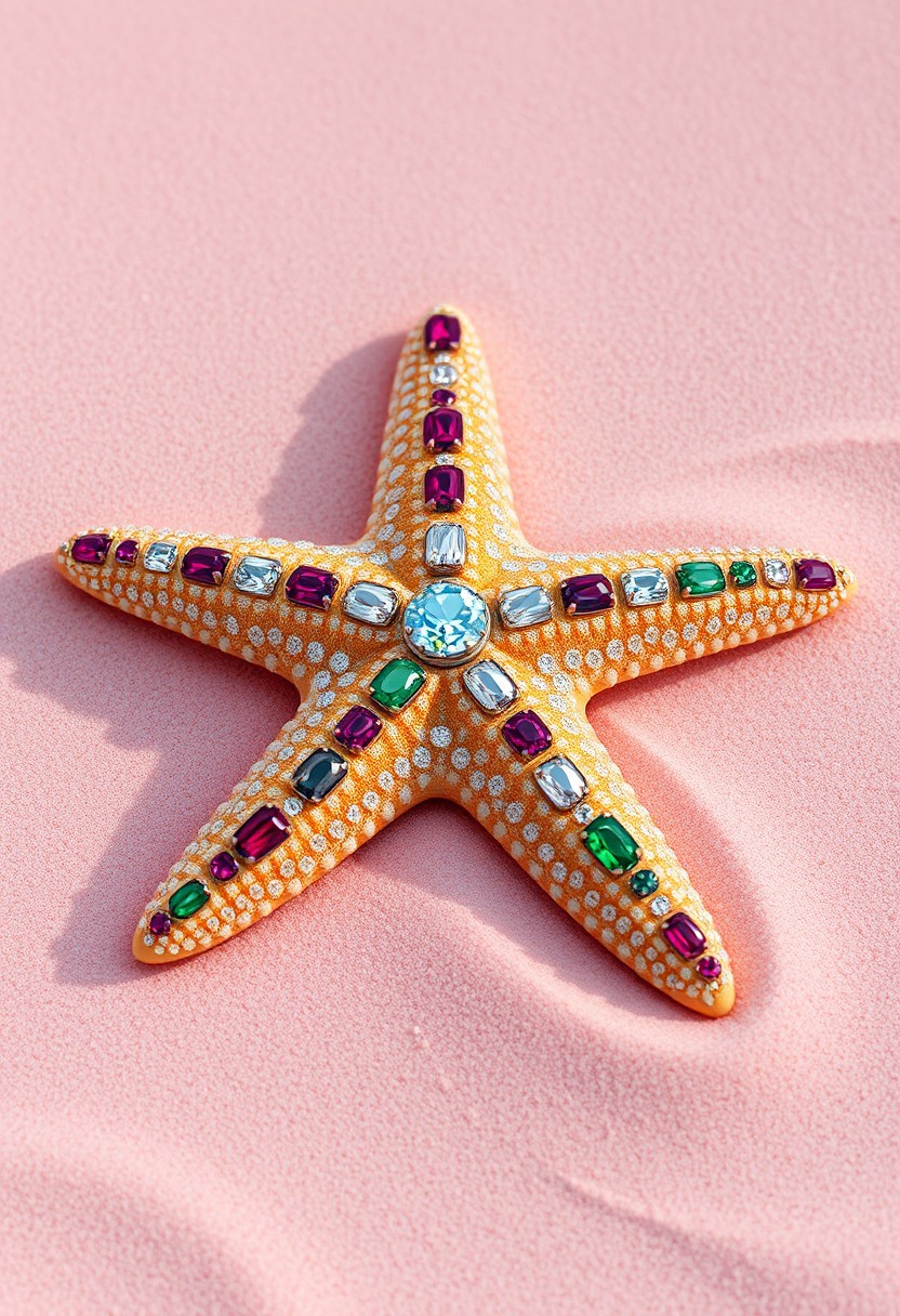 "Create a hyper-realistic image of a starfish adorned with beautiful gemstones, its delicate arms and body intricately detailed. The starfish is covered in a variety of gemstones, including rubies, emeralds, and diamonds, which sparkle and shine in the light. The starfish is laying on a perfect pile of pink sand, which is smooth and untouched. The sand is rendered in exquisite detail, with every grain and texture visible. The overall effect is one of serene, underwater beauty, as if the starfish is a treasure from the ocean floor." Highest-Quality, 8 k, intricate details, visually stunning, Masterpiece