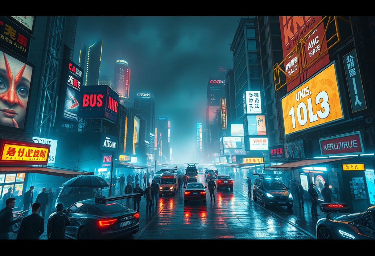 cyberpunk cityscape, futuristic skyline, neon lights, crowded streets, bustling market, robotic vendors, holographic billboards, sleek flying cars, dense fog, rain-soaked pavement, ultra-modern architecture, glass towers, glowing advertisements, gritty, reflective surfaces, towering skyscrapers, dystopian atmosphere, nighttime setting, (highly detailed:1.3), cinematic lighting, chaotic energy, sleek machinery, artificial intelligence, (bright neon colors:1.4), organic technology fusion, cybernetic organisms, tech-enhanced humans, illuminated signage, (hyper-detailed), bustling metropolis, futuristic clothing, holographic displays, high-tech gadgets, sharp contrast, dynamic perspective, sleek aesthetics, ultra-modern design, glossy surfaces, reflective streets