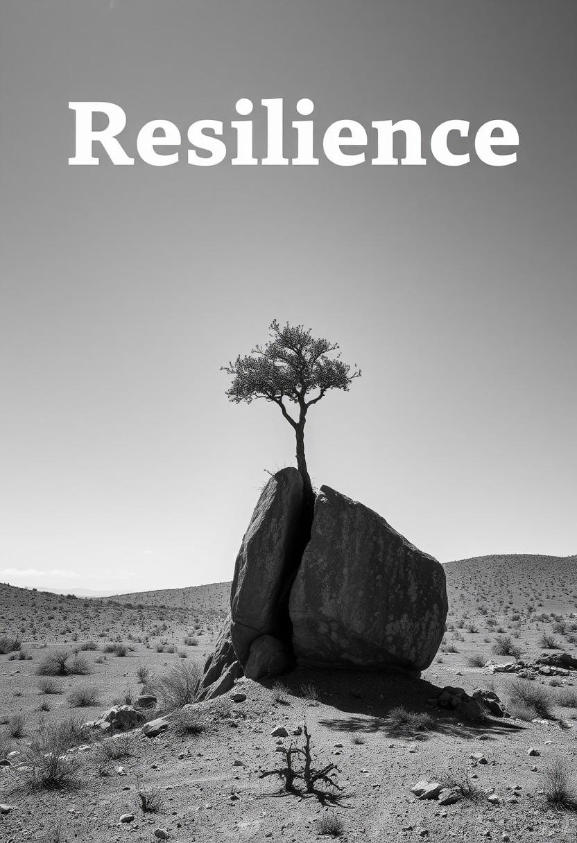 A black-and-white photograph of a lone tree growing through a crack in a solid rock, towering over the barren landscape. The word 'Resilience' is written at the top in a strong, bold font