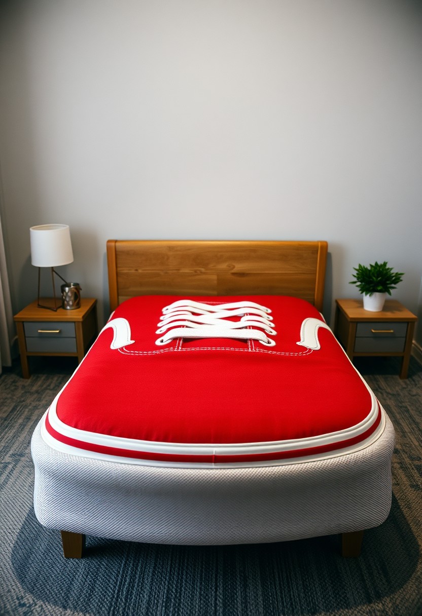 A bed that looks like a giant sneaker. (((the mattress has side like the rubber sole of a sneaker))) Red canvas Vans_Authentic sneaker, detailed sneaker, perfect sneaker, visible heel of sneaker