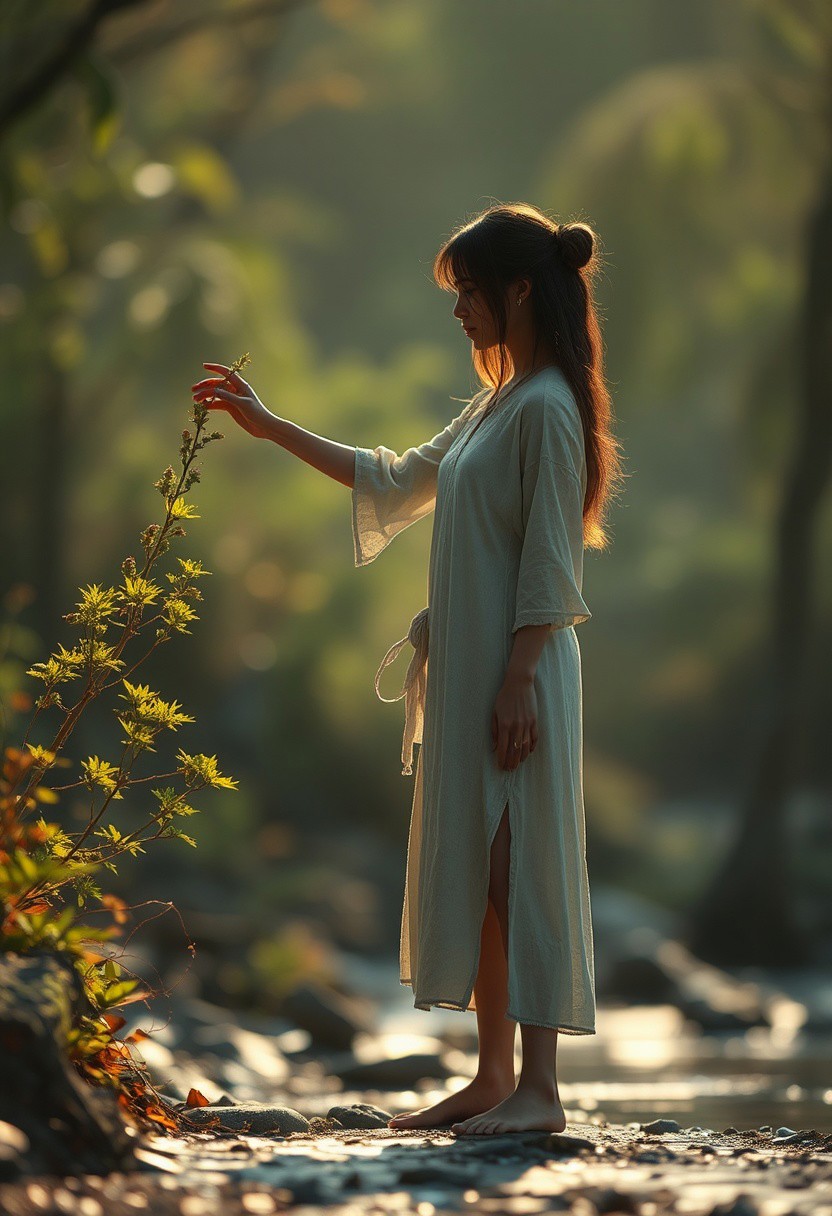 lone roguish female figure, standing, reaching out to touch a plant, stone, or water, connecting with nature, soft light, serene atmosphere, grounded, candid, subtle expression, lost in thought, engaging with surroundings, quiet action, (captured naturally:1.2), unplanned moment, peaceful, connection to nature, cinematic, (detailed background:1.3), natural light, dramatic lighting, depth of field, (photorealism:1.4), 8k UHD, (blurry:-1.3), (lowres:-1.5), (ugly:-1.2), (mutated:-1.4), (worst quality:-1.4), (bad anatomy:-1.3), (cartoon:-1.1), (sketch:-1.1), (distorted proportions:-1.3), (extra limbs:-1.5), (cgi:-1.4)