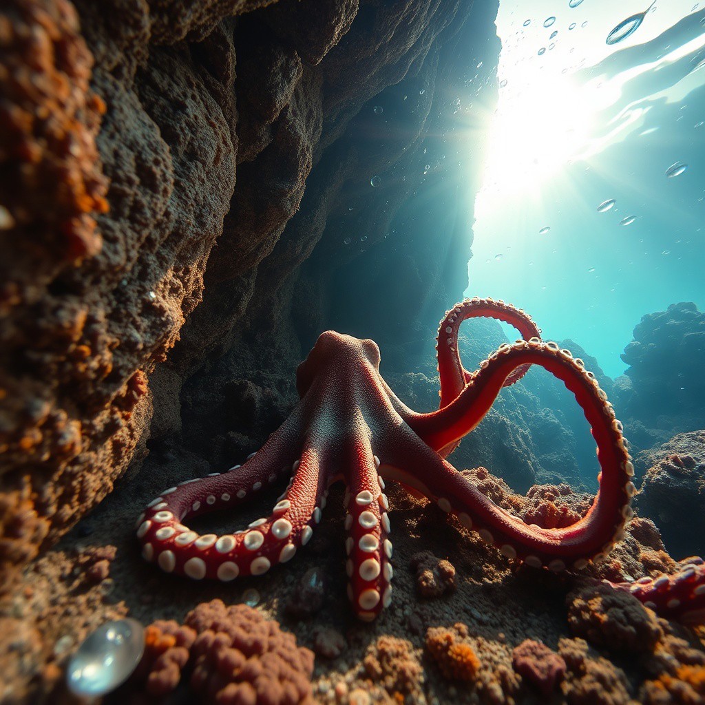 a very detailed close picture of a n octopus underwater near an intricate rock formation, sunlight pasing throw water