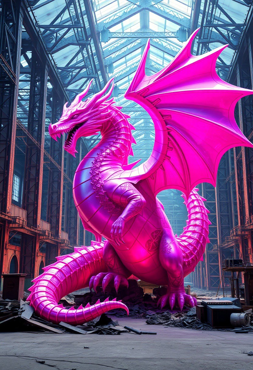 (low quality:-1.2), dragon, abandoned factory, recursive shapes, multichromatic colors, (disjointed anatomy:-1.3), (bad composition:-1.3), stark lighting, rigid structure, (overloaded multichromatic colors:1.6), (overly ornate:-1.5), saturated hues, diverse color palette, (smooth surfaces:-1.4), (soft lighting:-1.2), (noisy:-1.1), infinite geometry, minimalist design, intricate fractal structures, exaggerated features, psychedelic tones, (blurry:-1.2), sculptural appearance, vibrant, (polished:-1.3), (ugly:-1.3), intersecting planes, photorealism, minimal details, unsettling, (emphasis on sharp geometric form:1.6), fractured geometry, unrefined textures, neon glow, sharp and jagged geometric patterns, angular geometric forms, high resolution, primal aesthetic