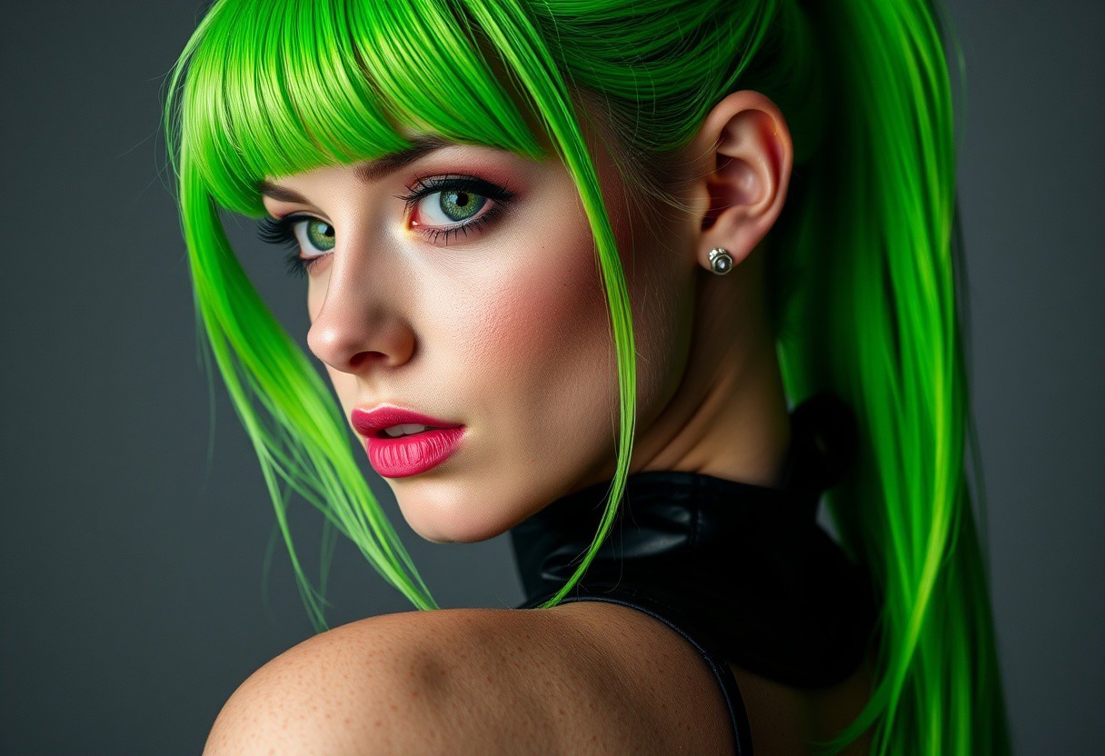 score_9, score_8_up, score_7_up, score_6_up, score_5_up, score_4_up, 1woman, RAW photo, (freckles:0.8), long ponytail, neon green hair, medium close-up shot side view, latex corset (busty 44d:1.5), extremely detailed, beautiful detailed green eyes, full lips, pale skin, neutral expression, neutral gray background, studio lighting , in the style of (kyuYong Eom:1.0)