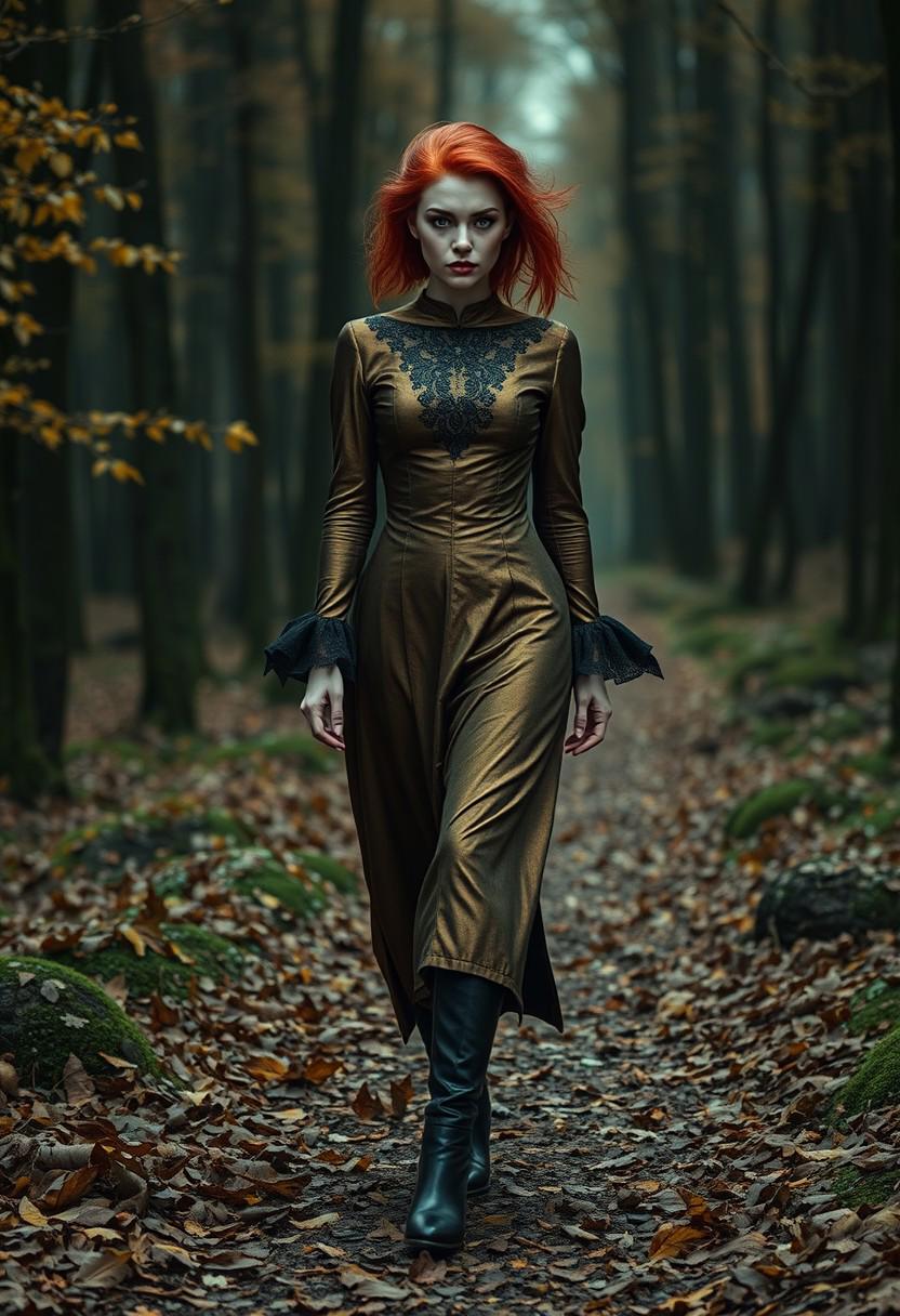 ultra realistic, super realistic. UHD. 8K, RTX,, gothic style dark fantasy style, vamp style, , <lora:epi_noiseoffset2:1> ,An atmospheric and powerful dark fantasy, , (realistic:1.3, 16K, top quality, masterpiece, Ultra-high resolution), Autumn landscape, forest, a beautiful well-groomed adult woman withmessy fluffed red hair and green eyes strolls through the forest, she is dressed in a dark gold flared gothic dress, black lether boots, fallen leaves under her feet,