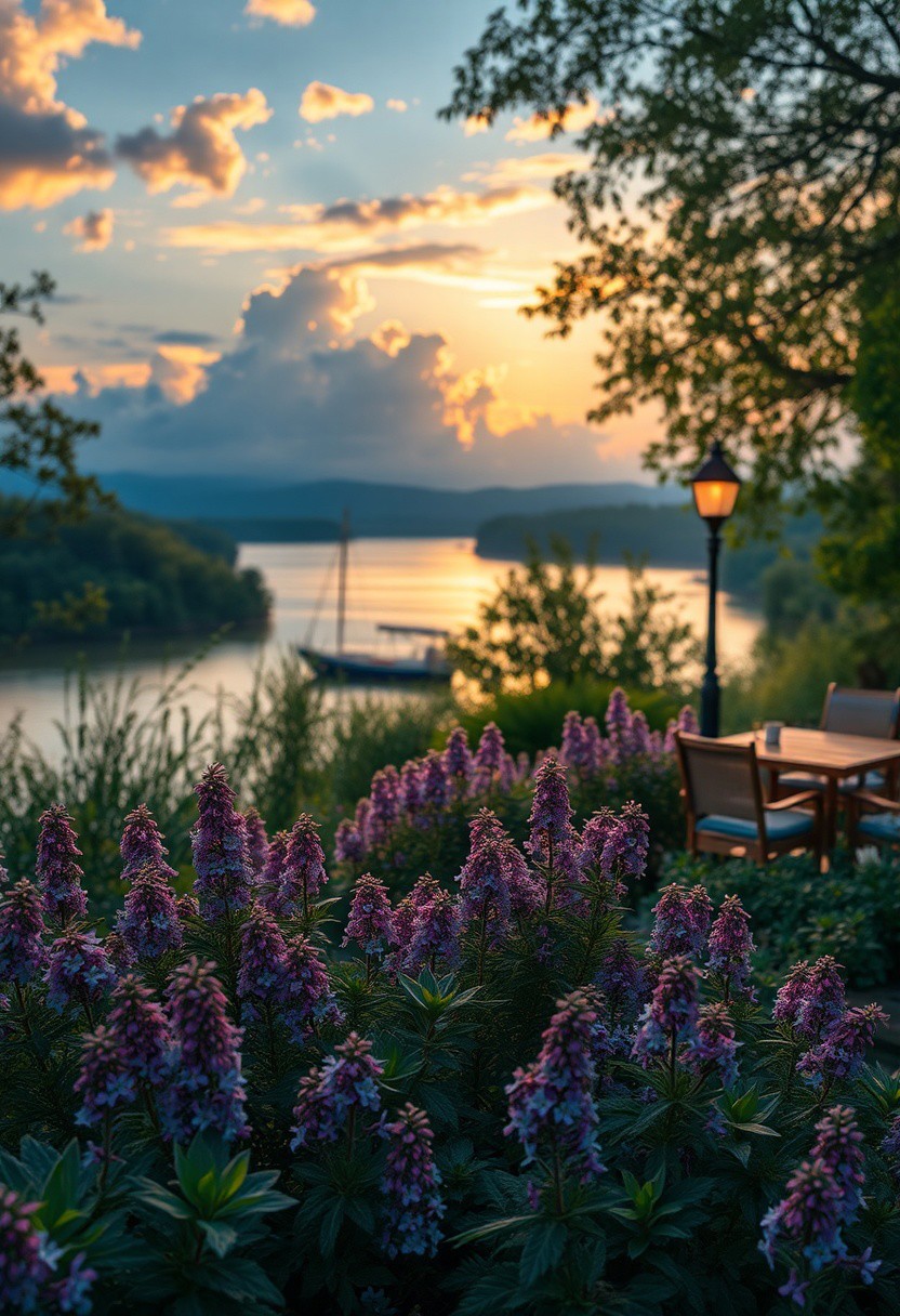 detailed background,( Calm spring night landscape), amongst lush greenery, beautiful view, creeping phlox in full bloom, creeping phlox, early morning, sunrise sky, beautiful clouds, dappled sunlight, outdoor seating, one lamp, Tranquil Lake, Boat on a Lake, depth of field, masterpiece, best quality, ultra-detailed, very aesthetic, illustration, perfect composition, intricate details, absurdres, moody lighting, wisps of light, no humans,