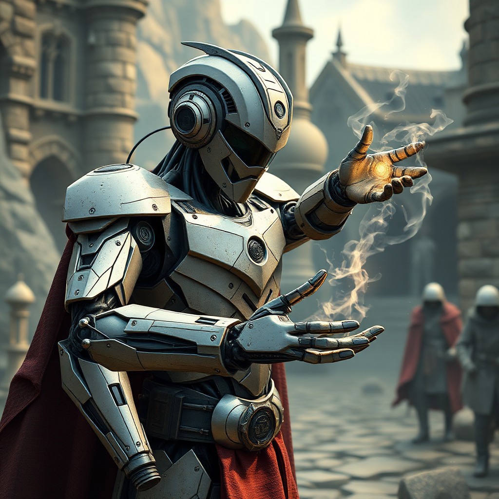 highly detailed, a high-tech robot in a medieval world conjuring a spell, the robot contrasts with the world around it