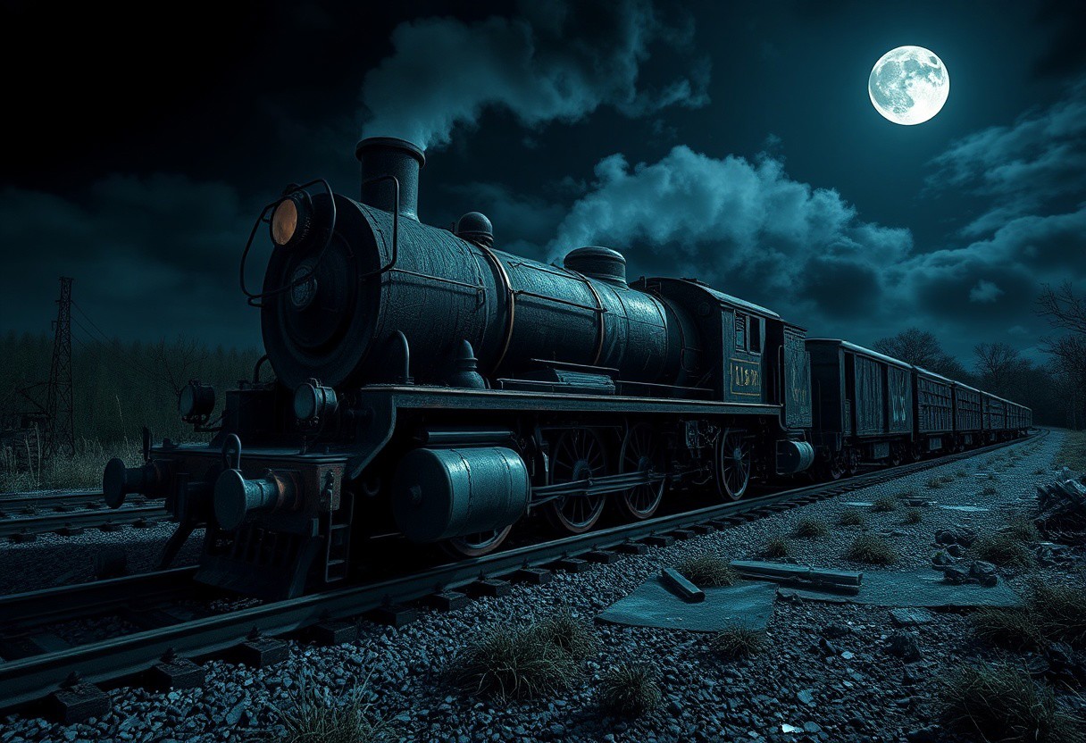 An abandoned steam train on a railway track under a moonlit night, intense and dramatic, intricated details, hyper realistic, cinematic view, dark steam ambiance. <lora:art_lora:1><lora:realism_lora:1>