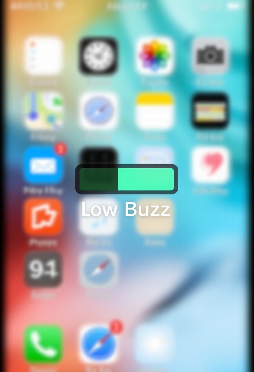 iphone screenshot with apps, battery low, text: "Low Buzz", sharp