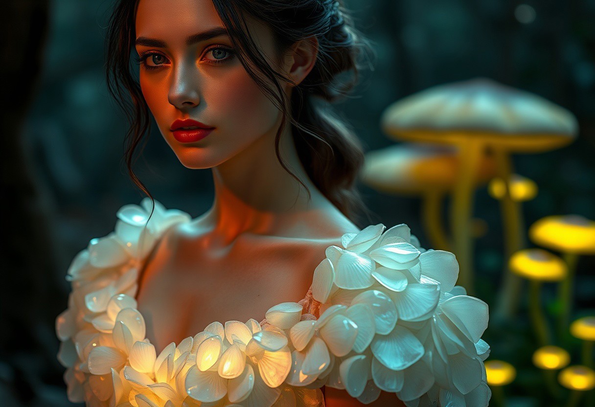 A detailed portrait of a woman in an elegant dress made of luminescent, shell-like structures, blending seamlessly with her soft skin. The scene is set in a dark, enchanted forest with glowing mushrooms in the background. The lighting emphasizes the glossy textures of her gown, creating a mystical atmosphere.