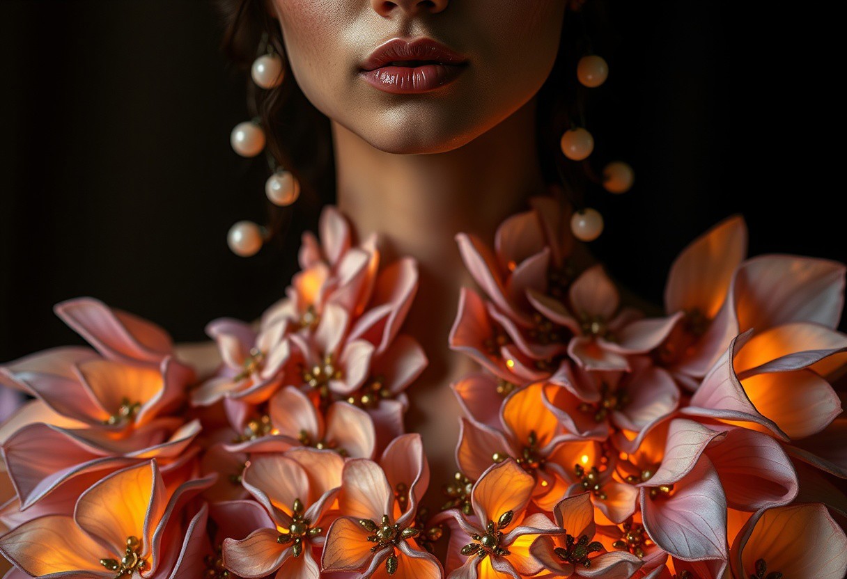 A close-up portrait of a woman wearing a sculptural gown adorned with intricately detailed petals in shades of gold and lavender. Her hair is entwined with glowing, pearl-like ornaments. The lighting creates dramatic contrasts between the glow of her outfit and the deep shadows behind her, giving her an ethereal, almost divine presence.
