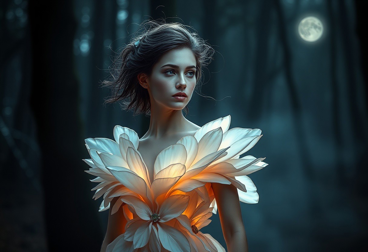 A young woman in a sculptural gown made of iridescent, translucent petals that radiate soft light. Her hair is styled with flowing organic tendrils, and she stands in a dark, misty forest. Subtle beams of moonlight break through the mist, casting gentle highlights on her serene expression.