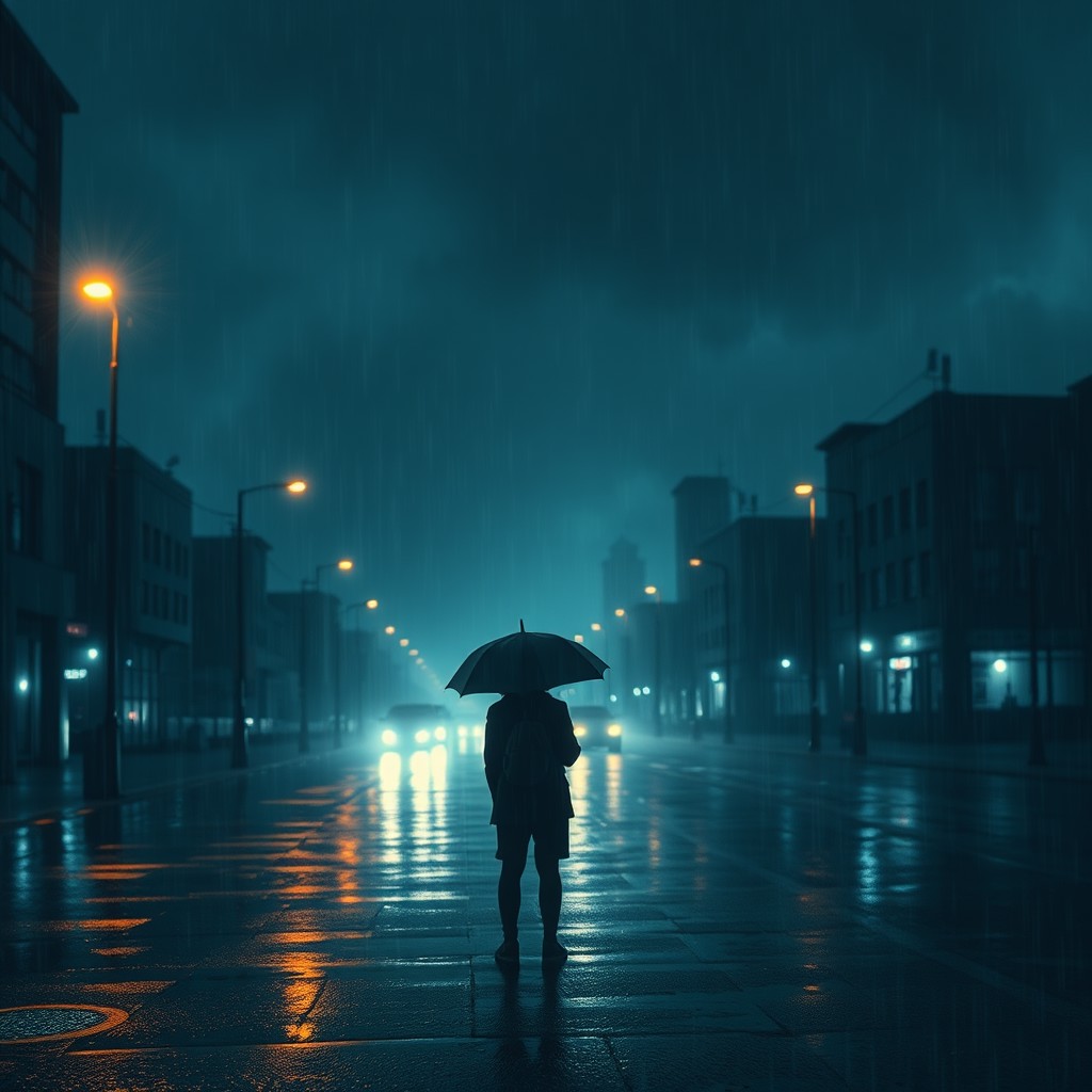 A dimly lit, rainy street at night, with soft streetlights casting a faint glow. In the foreground, a person stands alone under an umbrella, their figure slightly blurred, symbolizing fading memories. The city behind them is empty and distant, with reflections of lights on the wet pavement. The sky is cloudy, with faint stars barely visible, adding a sense of loneliness and melancholy. A soft, fading spark in the background symbolizes the lost hope and emotions fading away. The overall color palette should be cool tones, with shades of blue, gray, and a touch of warm amber from the streetlights.