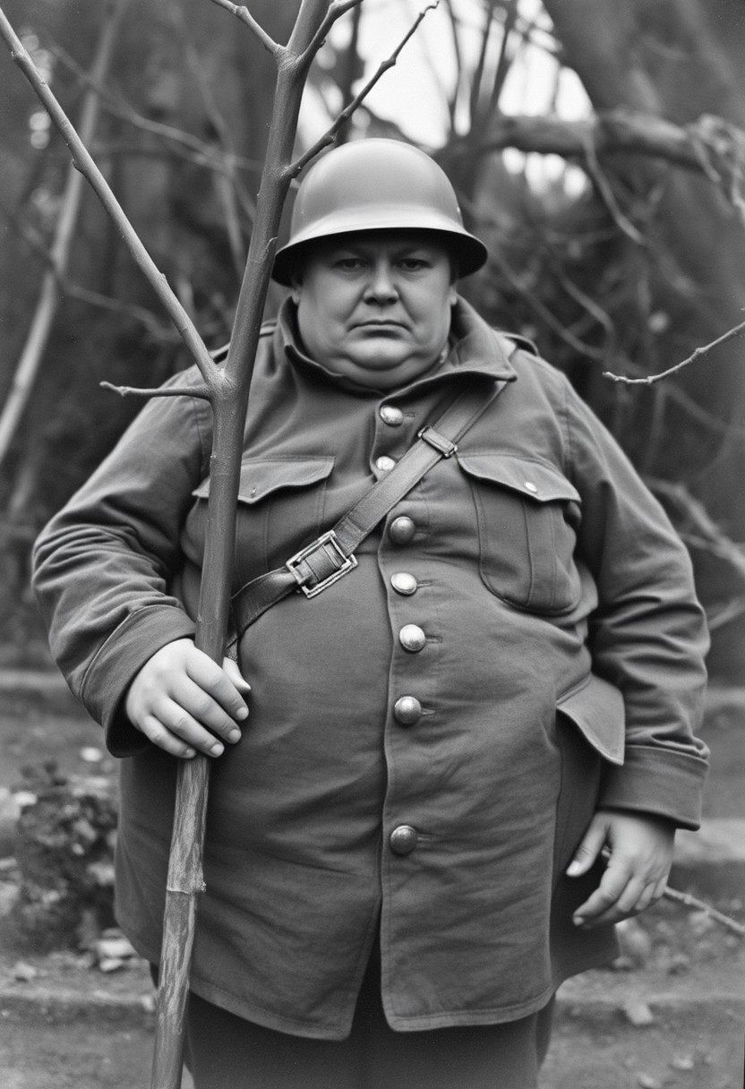 A old black and white photo of a morbidly obese ww1 soldier hiding behind a twig