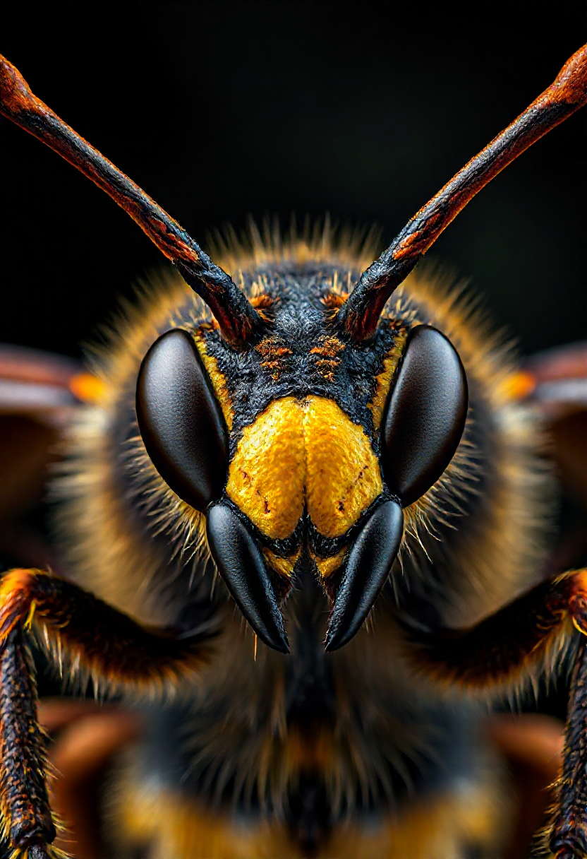 Asian giant hornet,Breathtaking,8k resolution,extremely detailed,beautiful,establishing shot,artistic,hyperrealistic,ultra realistic render,extremely fine details,like-like render,cinematic lighting,dramatic lighting,masterpiece,light brazen,extremely detailed and beautiful face,150mm,HDR10,