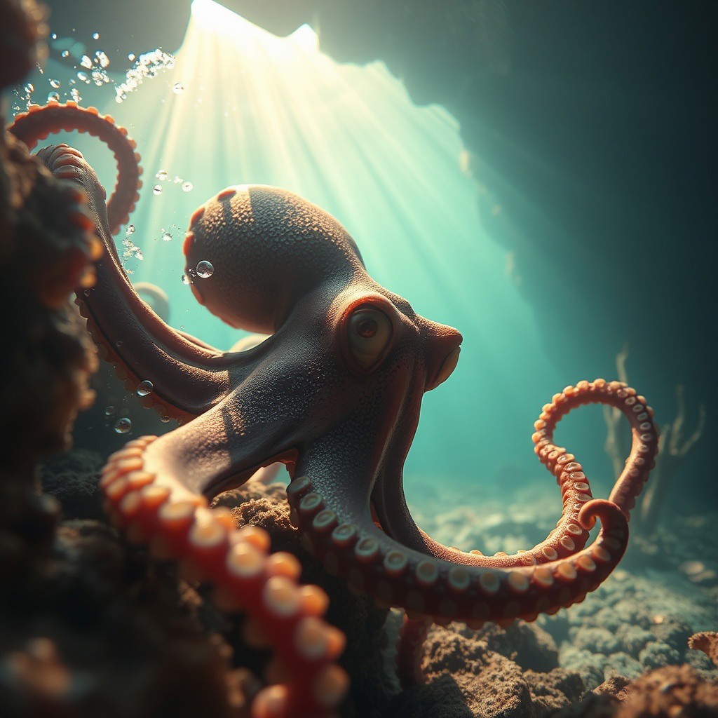 a very detailed close picture of an octopus escaping a labirinth underwater near ,sunlight pasing throw water