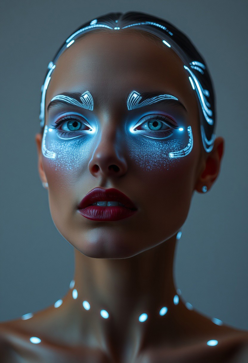 integrated LED body modification, permanent LED makeup, subtle glowing accents under the skin, (embedded LEDs:1.3) illuminating cheekbones and jawline, soft projected makeup, light patterns shifting with expressions, (flawless skin:1.4), futuristic yet natural, gentle LED glow defining facial features, seamless tech-enhanced beauty, (subtle under-skin glow), elegant LED accents on lips and eyes, ultra-modern body modification, high-definition, (good anatomy:1.4), radiant skin with integrated lighting, permanent light contours, soft and natural light projection, smooth textures blending LED with skin, facial definition enhanced by internal light, glowing accents integrated into facial structure, high-resolution, timeless beauty with advanced technology, LED glow replacing traditional makeup, precise lighting contours