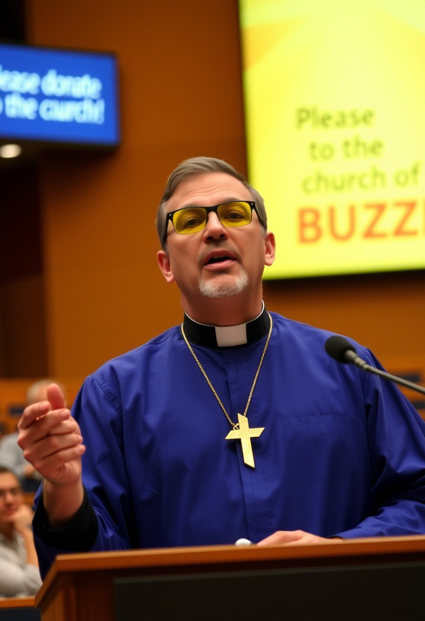 Man wearing yellow tinted glasses and a blue priest uniform inside auditorium behind podium preaching, he is wearing golden lightning bolt symbol necklace prominently visible, behind him is a sign with text "Please donate to the church of BUZZ!". No cross symbol.