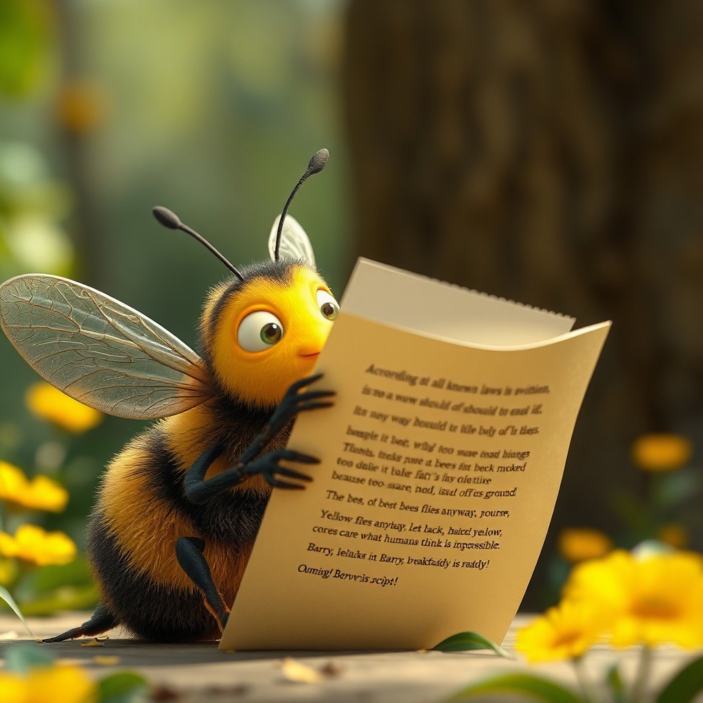 An Bee reading a big peace of paper saying: "Bee movie script According to all known laws of aviation, there is no way a bee should be able to fly. Its wings are too small to get its fat little body off the ground. The bee, of course, flies anyway because bees don't care what humans think is impossible. Yellow, black. Yellow, black. Yellow, black. Yellow, black. Ooh, black and yellow! Let's shake it up a little. Barry! Breakfast is ready! Ooming!"
