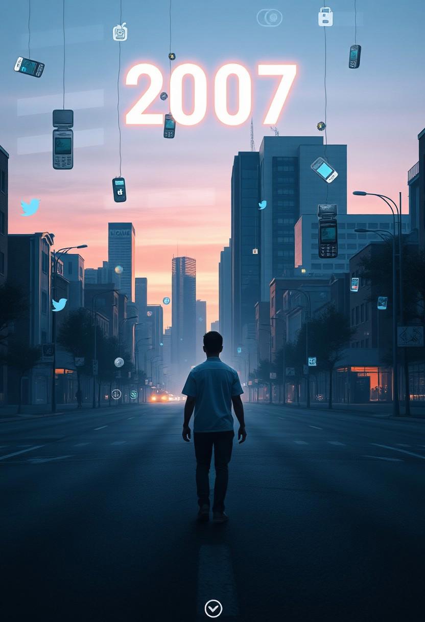 A surreal and nostalgic scene of a person standing in the middle of an empty street at twilight, surrounded by retro elements from the year 2007 — old flip phones, early social media icons, and outdated technology floating in the air. The background shows a faded city skyline with modern high-rises being overtaken by abstract, glitchy digital effects, symbolizing the 'modernization' that has passed. The person looks back at a large, glowing '2007' in the sky, symbolizing the unattainable past. The overall tone is melancholic, with cool and soft colors, blending reality with digital distortion