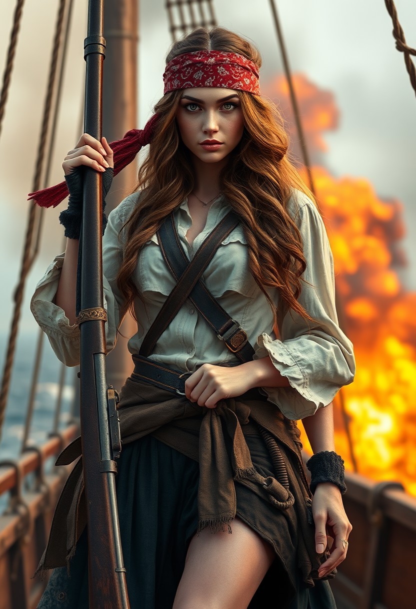 portrait of a stunning (Japanese:1.4) pirate woman, bandana, long wavy brunette hair, holding flintlock musket, standing on deck of burning ship, mythp0rt
