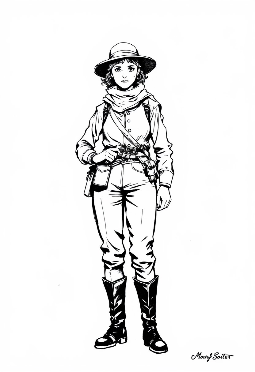 score_9, score_8_up, score_7_up, monochrome, female, 1930s relic hunter, explorer, full body, standing, plain white background, ink sketch