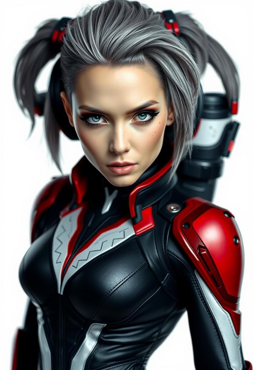 detailed photographic portrait, Anna, Wasp, powered futuristic outfit, black and red and white suit, grey punk hair with tattoos, semi shaved hair, white background, simple background