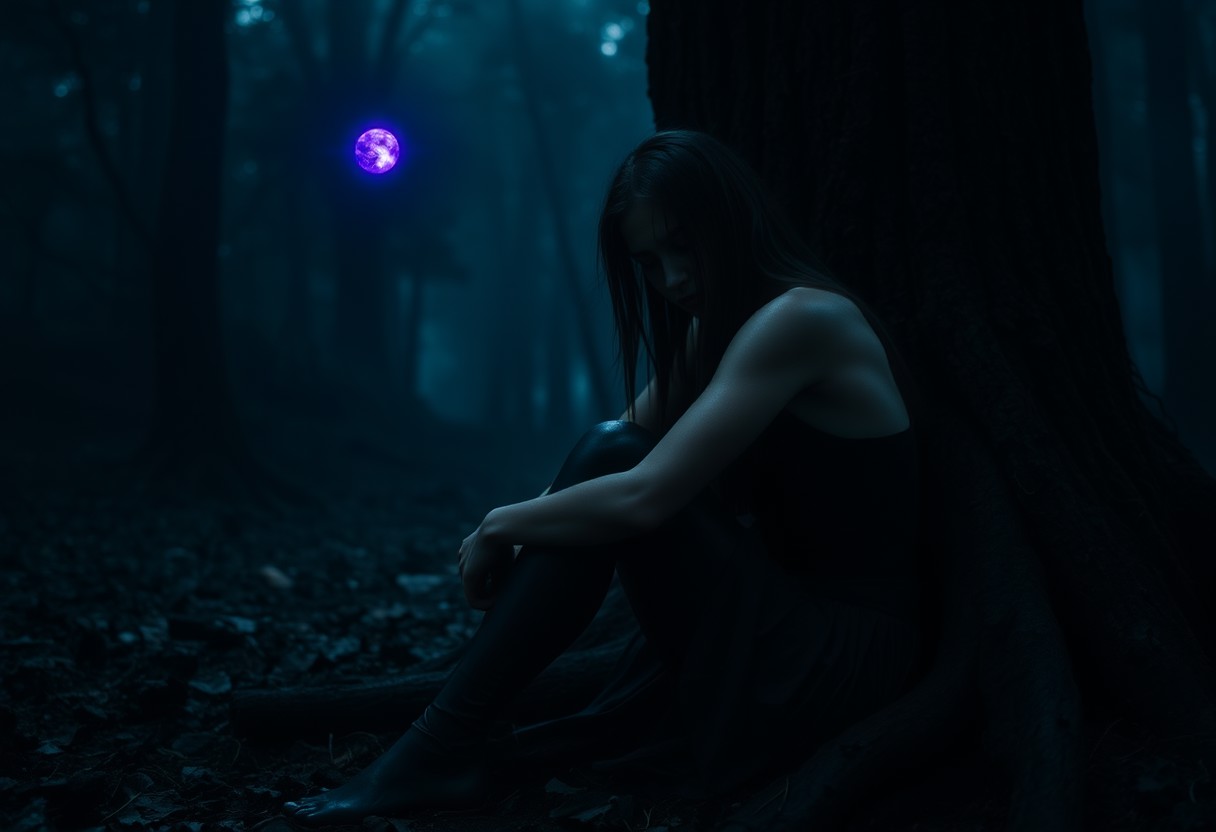 poor ambient light, dim dappled shadowed lighting, illumination only from unstable faint purple spell orb, goth themed, breathtaking Masterwork Hd cinematic photo, densely foggy dank ancient dark fantasy woods, young sleek beautiful Celtic woman, slippery vantablack latex infused materials , scared vulnerable lost soul, shyly huddled in darkness, sitting self-hugging knees, back against root/trunk