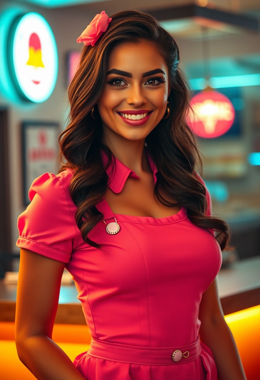 realistic photographic of a stunningly beautiful woman, a charming pin-up waitress model, sporting a vibrant pink uniform with a playful apron, engaging, flirty smile, atmospheric, irresistible gaze, sexy, masterpiece, best quality, dark and light neon mix, masterpiece midjourneyv6.1, volumetric lighting, expressive, warm colors, extreme energy, dynamic posing,