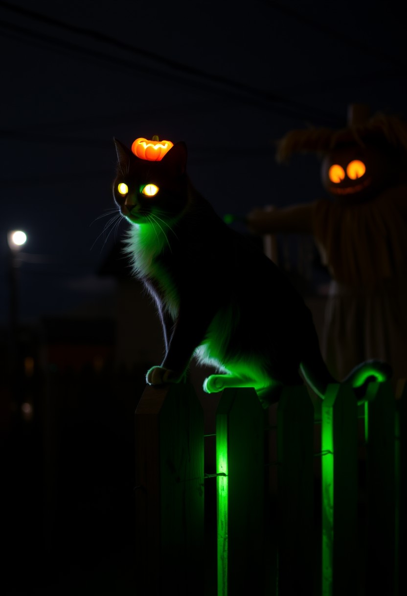 Spirit glowing cat walking on top of a fence, glowing pumpkin on its head, green light on its tail, scarecrow with glowing eyes in the background, gloomy atmosphere, night, Halloween