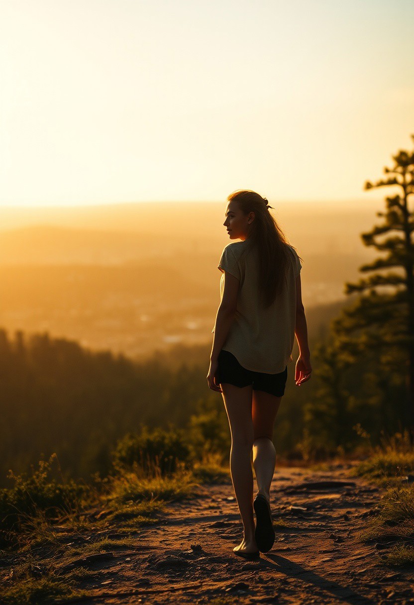 lone roguish female figure, walking away, glancing over shoulder, distant cityscape, transitioning from forest to urban environment, golden light of early morning or late afternoon, cinematic, journey progression, emotional warmth, subtle glance, candid, moment of doubt or hesitation, reflection on the journey, (forest in the background:1.2), city on the horizon, inviting introspection, natural light, dramatic lighting, depth of field, (captured naturally:1.2), (detailed background:1.3), (photorealism:1.4), 8k UHD, (blurry:-1.3), (lowres:-1.5), (ugly:-1.2), (mutated:-1.4), (worst quality:-1.4), (bad anatomy:-1.3), (cartoon:-1.1), (sketch:-1.1), (distorted proportions:-1.3), (extra limbs:-1.5), (cgi:-1.4), (extra characters:-1.5), (savanna:-1.4)