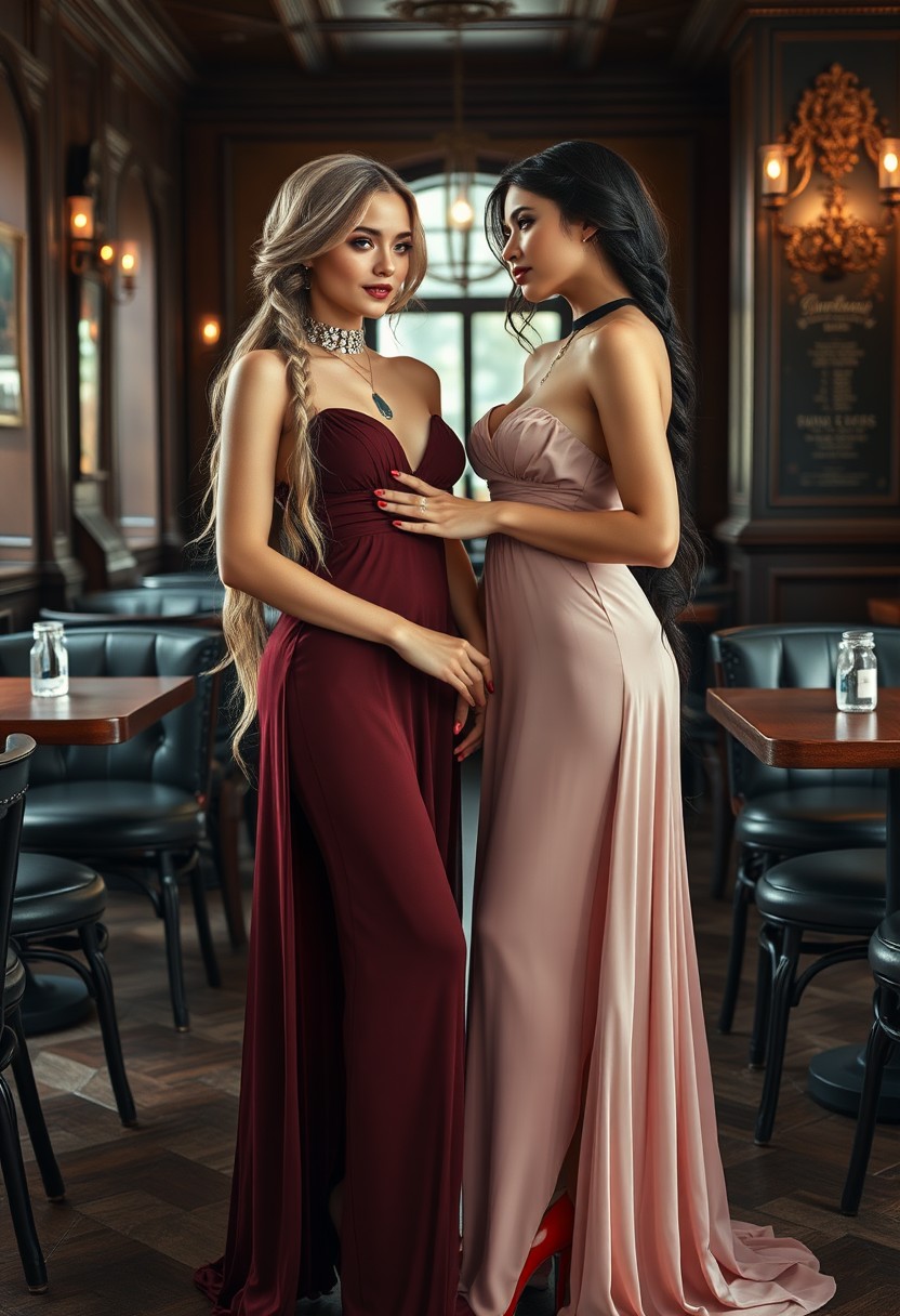 2 girls, age 24, foto realistic, perfect face, perfect bodies, perfect big breasts, choker with diamonts, high heels with diamonts, neckless with diamonts, tiny butt, midriff, big breasts, elegant expensive long dress with free shoulders and intrinsic details, pale natural skin with pores and dents, very long blonde hair, braided hair, black hair, glossy blue eyes, green eyes, smile at each other, best quality ,masterpiece, in irish coffee house, view from floor, hand at breast, holding hands, red high heels, jewlery, tattoo on throat, tattoo on chest, red lips, red finger nails,