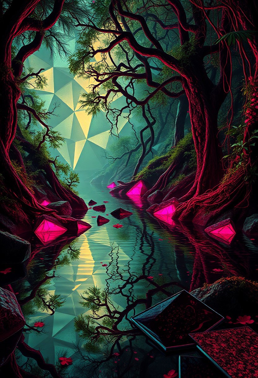 infinite geometry in water reflections, brutal edges, fractal-like ripples, (smooth surfaces:-1.4), smooth yet angular surfaces,gemstone, flowing organic forms, (low quality:-1.2), (bad composition:-1.3), raw, sculptural appearance, (overloaded multichromatic colors:1.6), vibrant, intersecting planes of water, mud, (soft lighting:-1.2), fragmented glowing elements, psychedelic tones, stark swamp lighting, neon glow from bio-luminescent plants, exaggerated features, (blurry:-1.2), saturated hues, (noisy:-1.1), rigid root structures, high resolution, (cartoonish:-1.1), sharp and jagged reflections in murky water, and plants, recursive patterns in moss and water, (rubygemstone:1.5), interlocking vines, dystopian vibe, unsettling, primal aesthetic, minimal details, unrefined textures, flowing organic geometry, (polished:-1.3), (disjointed anatomy:-1.3), intricate fractal structures in vegetation, (overly ornate:-1.5), photorealism, multichromatic colors, swamp, (ugly:-1.3)