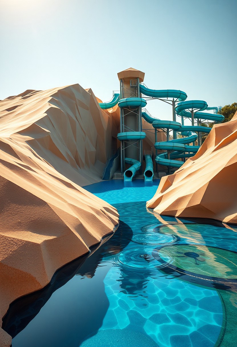 sand dune in a waterpark, vibrant oil pastel colors, sharp geometric sand formations, exaggerated polygonal shapes of sand dunes, flowing yet angular water slides, interlocking polygonal structures, multichromatic reflections on water pools, recursive patterns in the sand, fragmented terrain beneath the waterpark, intricate fractal structures in the slides and supports, glowing reflections on water, saturated hues of blue, turquoise, and sandy beige, sculptural, brutalist waterpark design, sharp angular water currents, dystopian vibe, stark lighting from sun and water reflections, minimal organic details, photorealism, high resolution, (emphasis on sharp geometric sand and waterpark forms:1.6), intersecting planes of water, sand, and slides, fractured geometry, rigid yet flowing structures, unsettling atmosphere, (blurry:-1.2), (ugly:-1.3), (polished:-1.3), (cartoonish:-1.1), (low quality:-1.2), (smooth surfaces:-1.4), (overly ornate:-1.5), (disjointed anatomy:-1.3), (noisy:-1.1), (bad composition:-1.3)