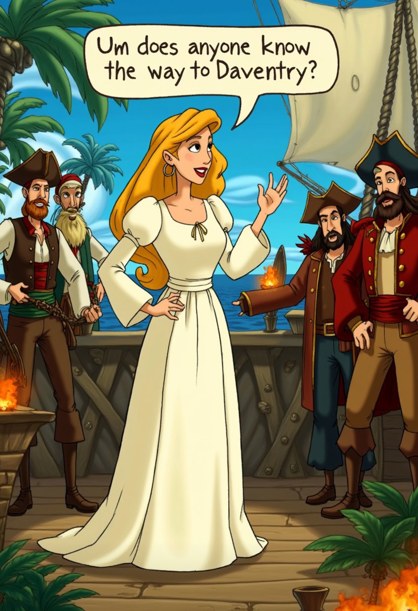 A beautiful blonde princess in a white robe talking to a group of pirates, speech bubble "Um does anyone know the way to Daventry?"