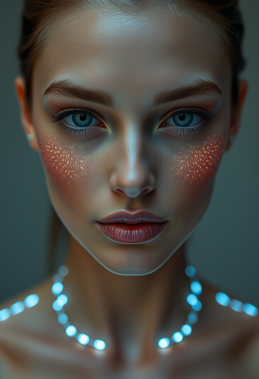 integrated LED body modification, permanent LED makeup, subtle glowing accents under the skin, (embedded LEDs:1.3) illuminating cheekbones and jawline, soft projected makeup, light patterns shifting with expressions, (flawless skin:1.4), futuristic yet natural, gentle LED glow defining facial features, seamless tech-enhanced beauty, (subtle under-skin glow), elegant LED accents on lips and eyes, ultra-modern body modification, high-definition, (good anatomy:1.4), radiant skin with integrated lighting, permanent light contours, soft and natural light projection, smooth textures blending LED with skin, facial definition enhanced by internal light, glowing accents integrated into facial structure, high-resolution, timeless beauty with advanced technology, LED glow replacing traditional makeup, precise lighting contours