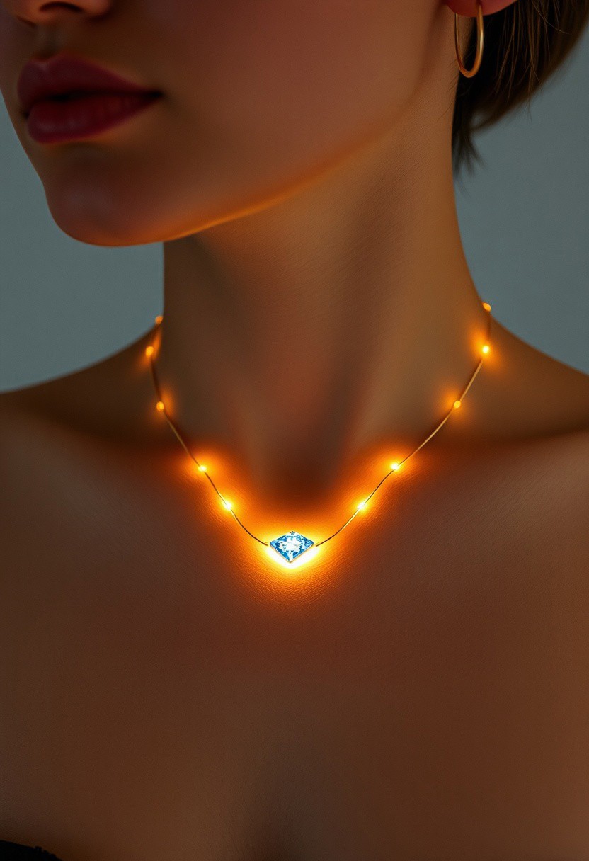 subdermal LED jewelry, (internal LED glow:1.5), (embedded LEDs:1.6) forming an illuminated necklace beneath the skin, soft golden light radiating subtly from within, sapphire-like glow centered on the clavicle, (elegant fashion:1.5), seamless integration of light under the skin, high-definition, (natural skin tone:1.5), soft light diffusion, ultra-realistic skin textures, (glowing skin:1.6), advanced subdermal technology, (gentle glow enhancing facial features:1.5), modern and refined appearance, high-resolution, (sophisticated style:1.3), delicate light contours, tech-enhanced beauty, smooth light transitions, (refined fashion look:1.3), futuristic elegance, minimal external appearance, (nudity:-1.5), (revealing:-1.5), (suggestive:-1.5), (provocative:-1.5), (overexposed:-1.3), (explicit:-1.5), (unclothed:-1.5), (sexualized:-1.6), (immodest:-1.4), (inappropriate:-1.5)
