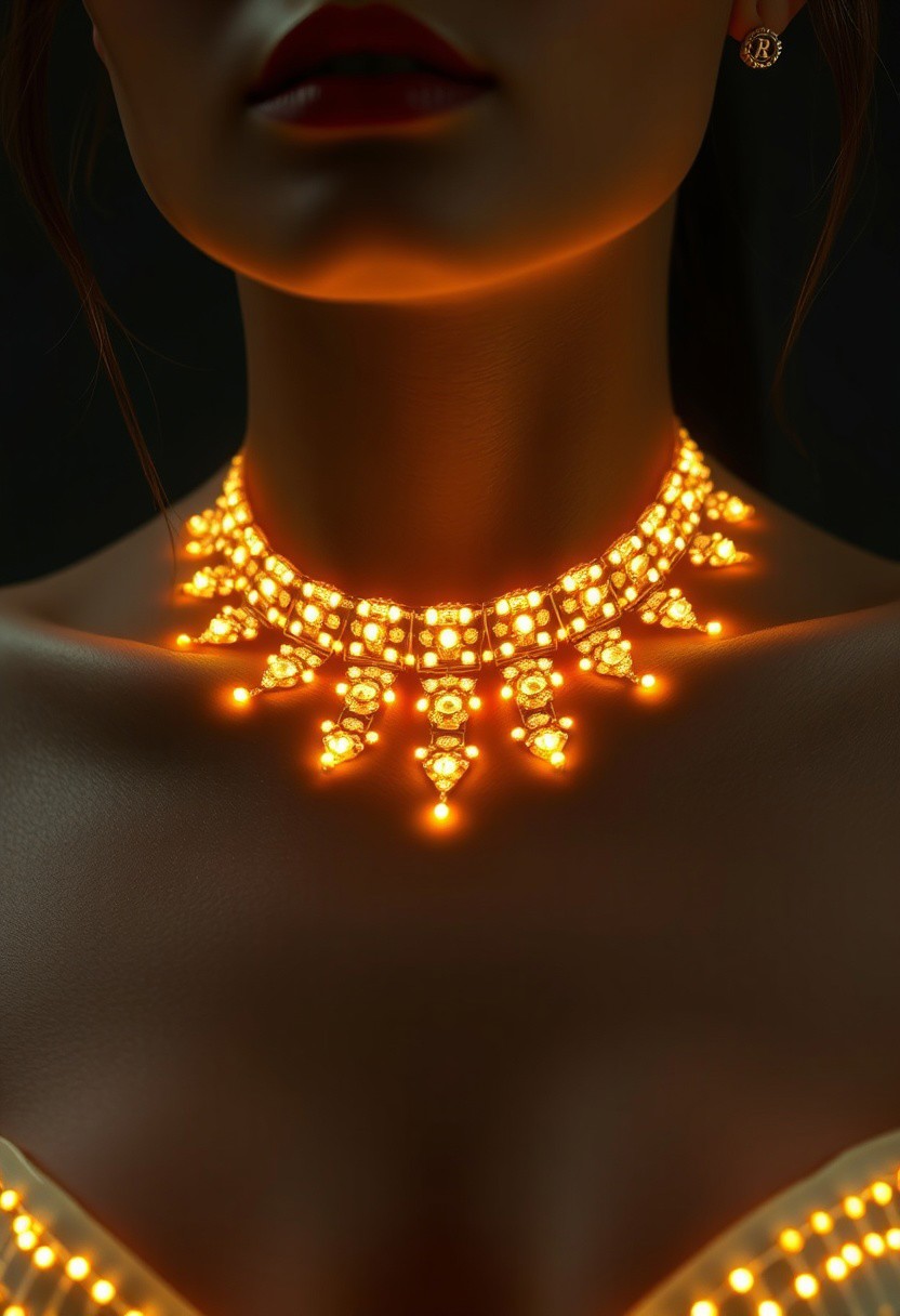 subdermal LED jewelry, (implant fashion:1.7), (vibrant internal LED glow:1.6) beneath the skin, (embedded LEDs:1.7) forming an extravagant illuminated necklace pattern under the skin, (golden light accents:1.5) glowing from beneath the surface, (sapphire-like LED glow:1.5) radiating along the collarbone, (elegant modern top:1.4), intricate and gaudy subdermal lighting design, (modest fashion:1.4), fabric seamlessly integrating with subdermal tech, high-definition, (natural skin tone:1.5), bright, bold light diffusion from under the skin, ultra-realistic textures, (gaudy but refined style:1.5), advanced subdermal technology, smooth transitions between skin and glowing light patterns, (tech-infused beauty:1.5), vibrant subdermal necklace effects, (futuristic elegance:1.5), high-resolution, glowing light accents under the skin, sleek and refined top complementing subdermal jewelry, (implanted jewelry:1.6), modern elegance with bold design, (nudity:-1.5), (revealing:-1.5), (suggestive:-1.5), (provocative:-1.5), (overexposed:-1.3), (worn jewelry:-1.7), (unclothed:-1.5), (explicit:-1.6), (immodest:-1.4)