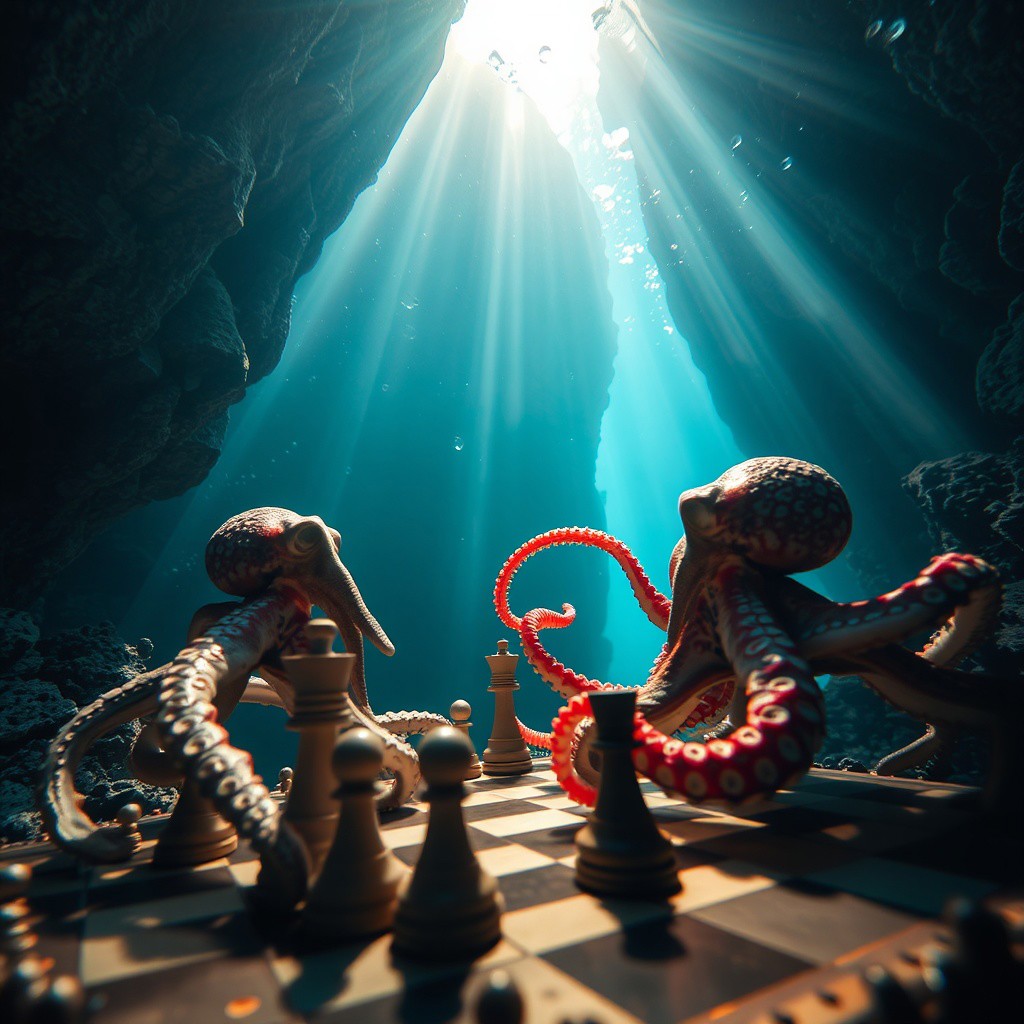 a very detailed close picture of a n octopus playng chess with another octopus underwater near an intricate rock formation, sunlight pasing throw water, chess pieces on the chess table