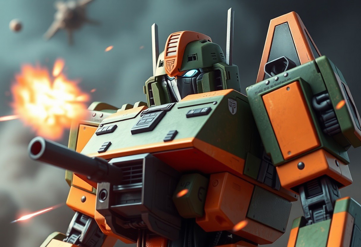 transformers generation 1, robot made of tank parts, scorn, with gorgeous detailed eyes in the style of precisionism, gaston bussiere, a picture, green and orange, tant turret, bucket helmet, wide focus, action pose, lasers, explosions, decepticon