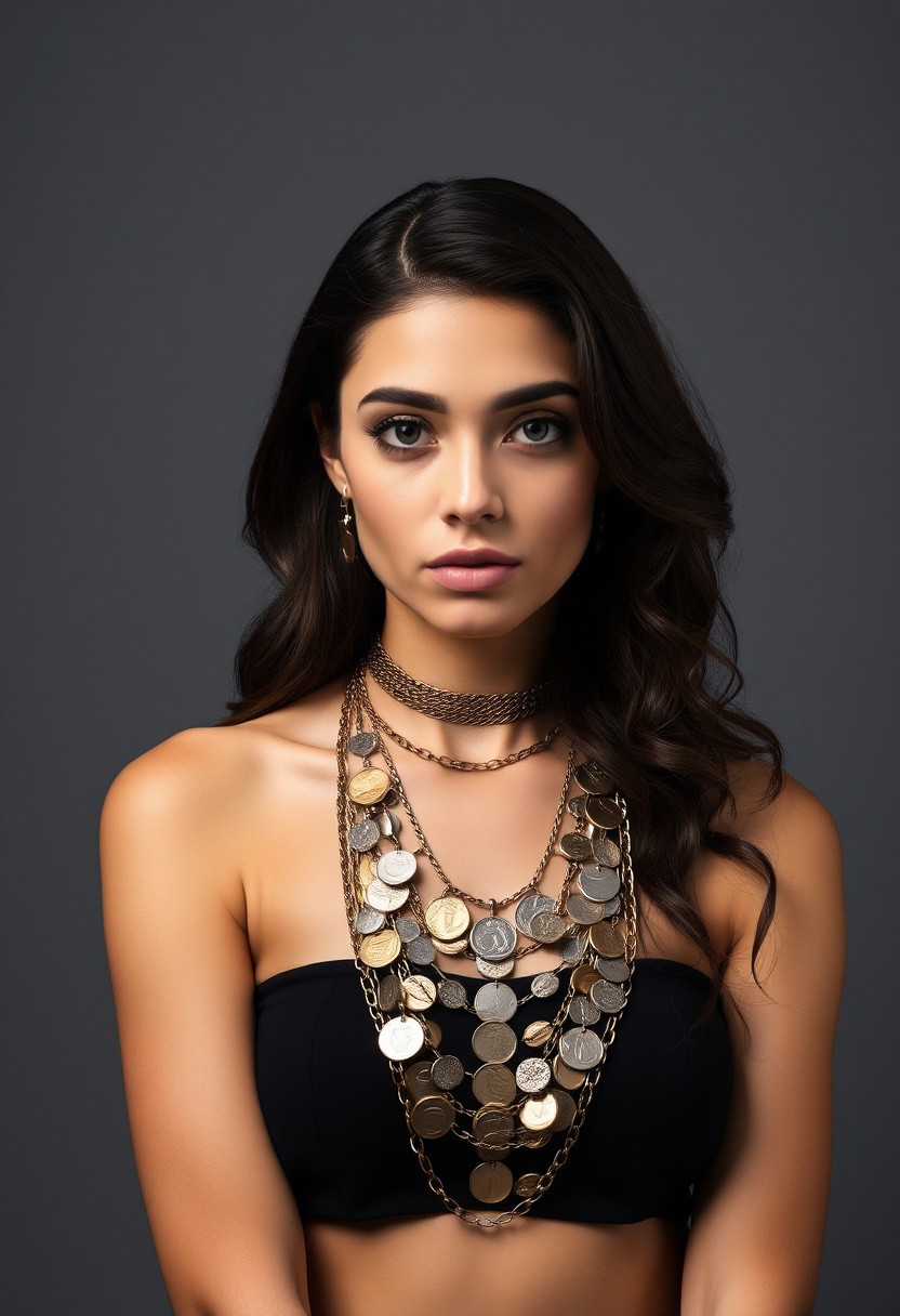 symmetrical front view, front view, beautiful woman with her left bare shoulder covered with jewelry made with coins and chains, grey background studio