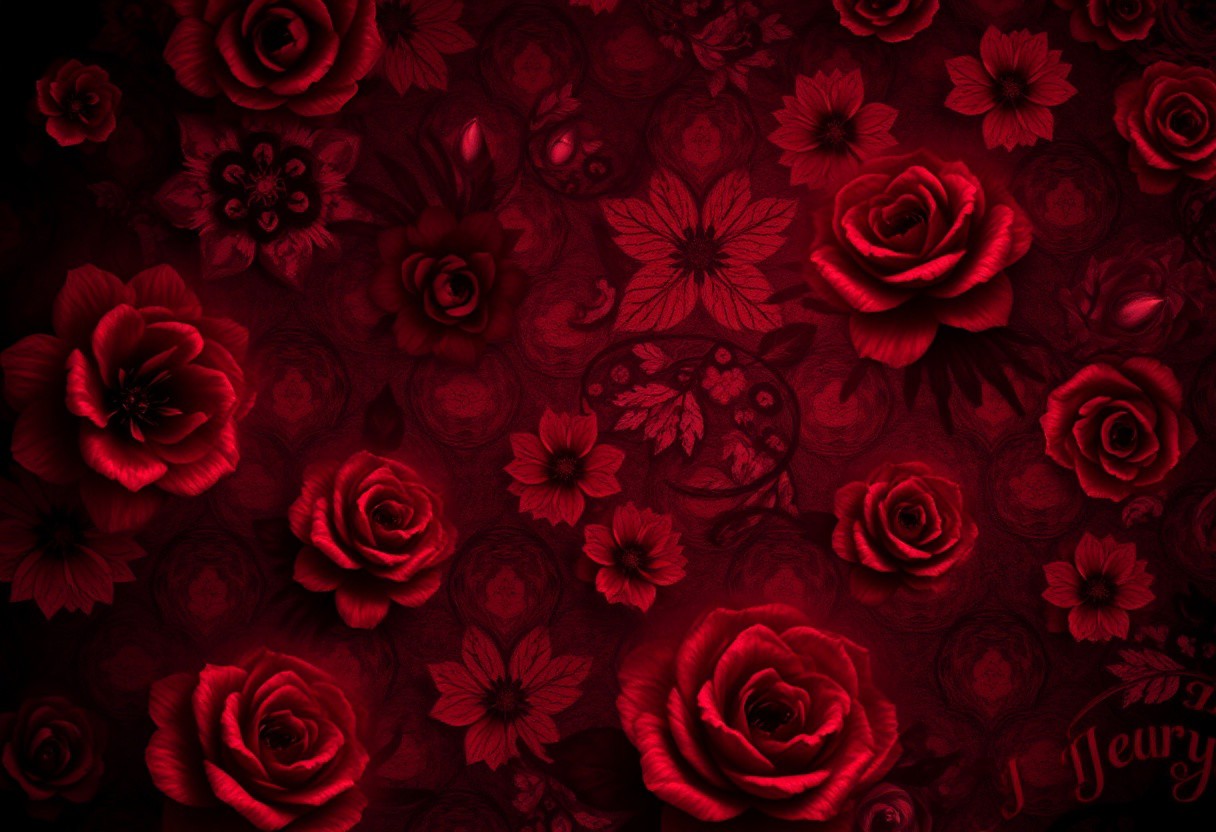 red floral ghostly Halloween spooky wallpaper, intricate patterns, dark gothic elements, high detail, eerie atmosphere, vivid colors, cinematic lighting, digital art, texture-rich, hauntingly beautiful design